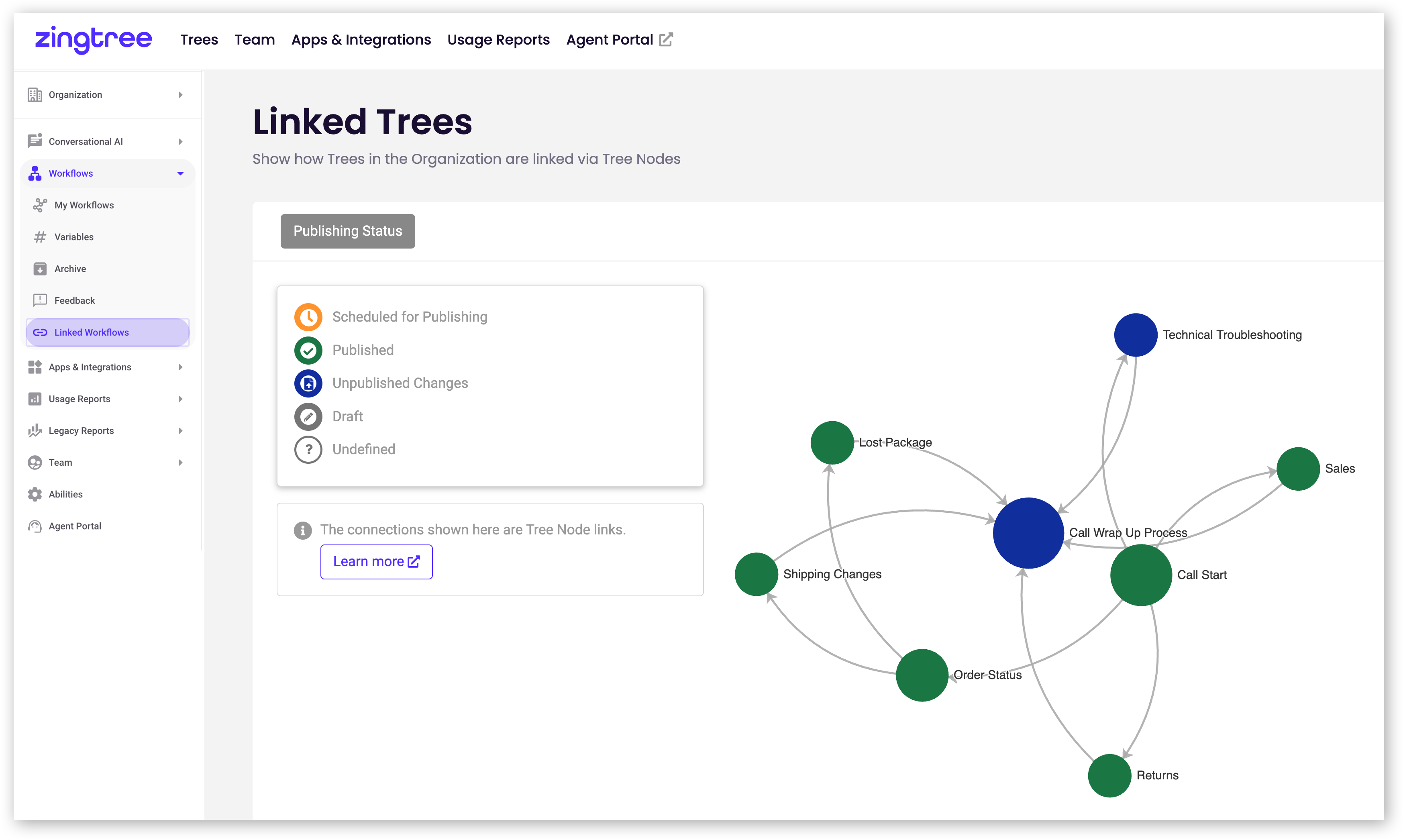 The Linked Workflows tool allows you to view the full system and web of linked trees in your organization. This can help you understand how the different trees are connected and how they interact with each other.