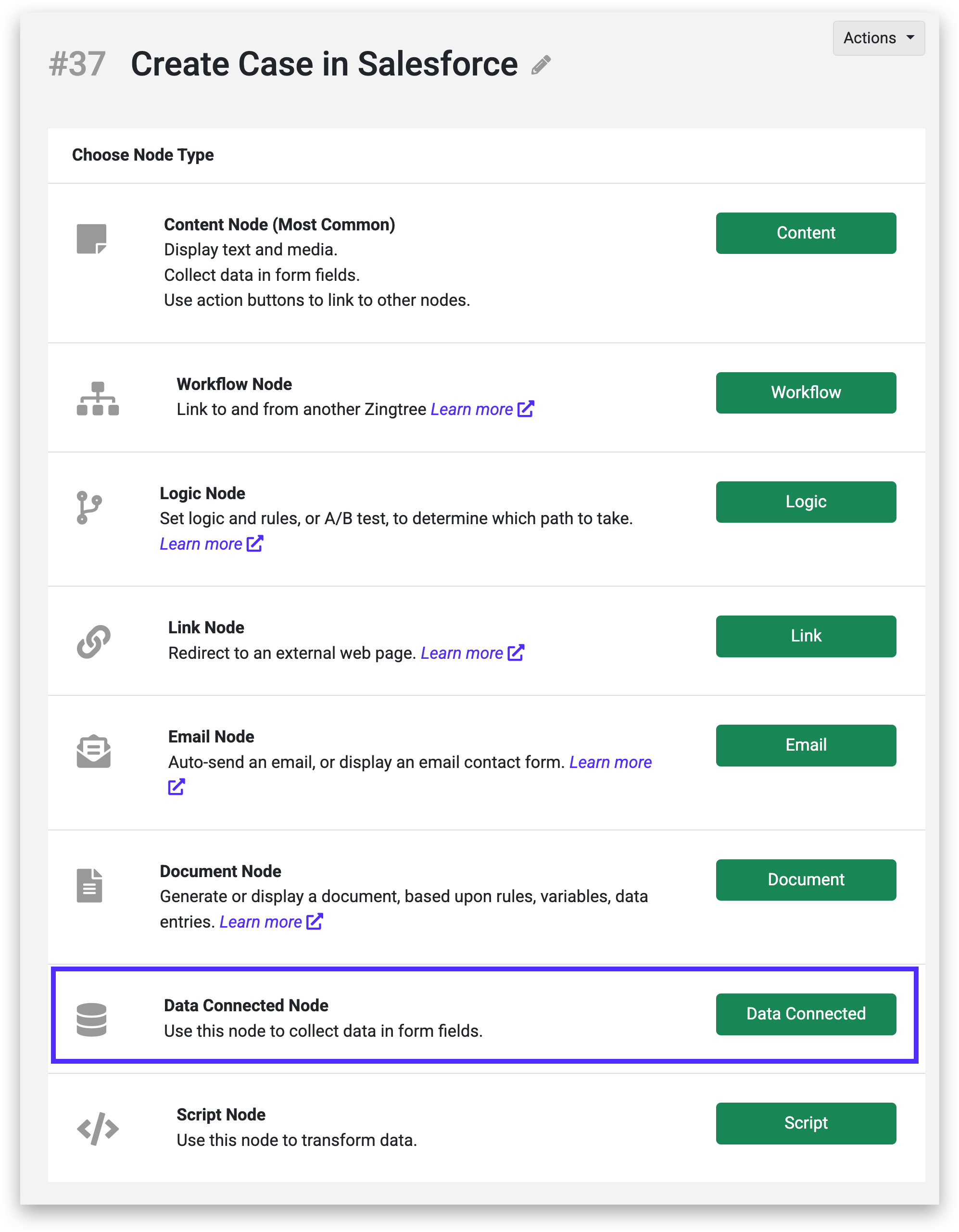 After configuration, Connected Objects can be integrated into Zingtree workflows. A Data Connected Node can then: