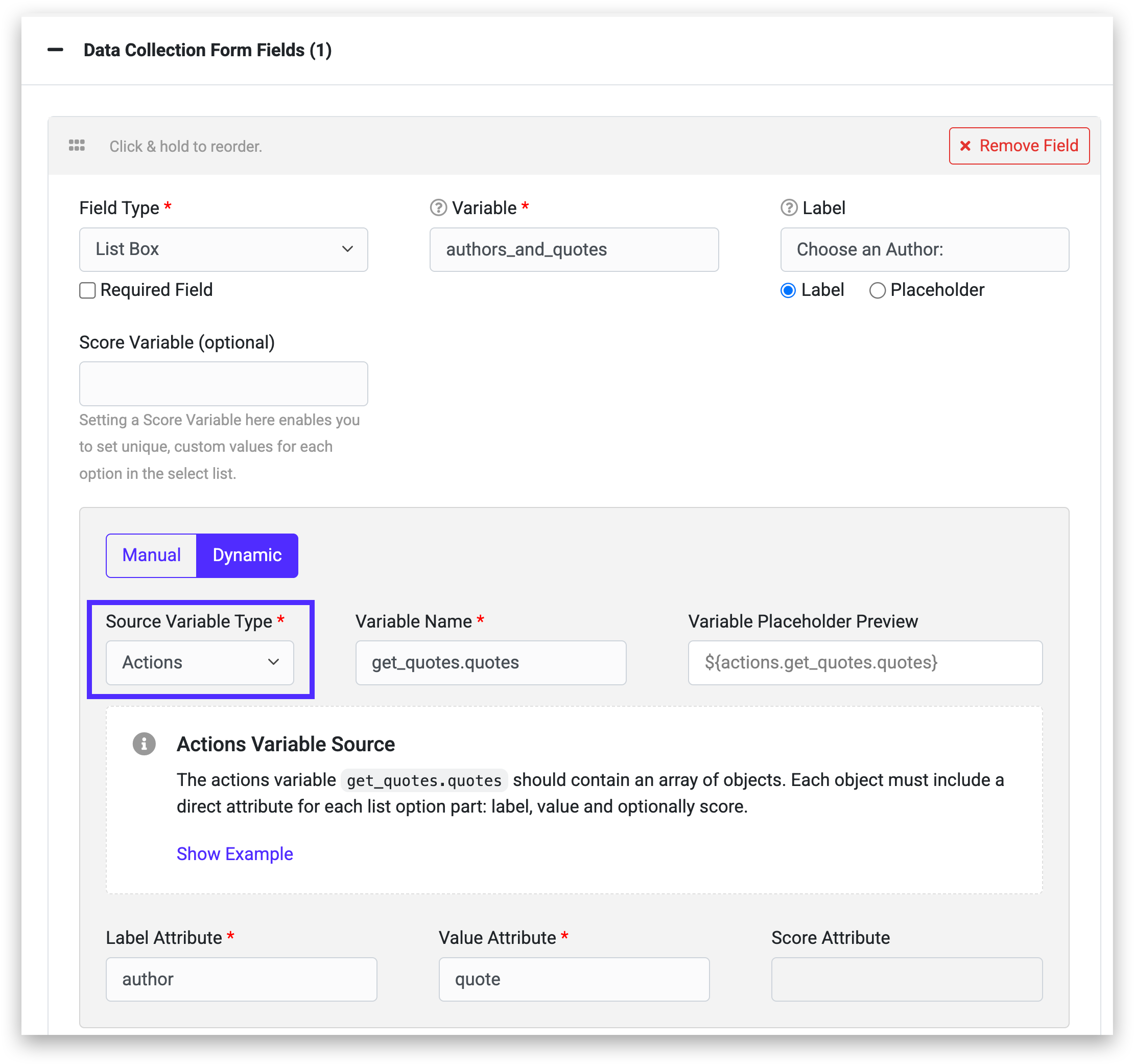 get_quotes.quotesbecause the name of our array in our database is quotes.Variable Placeholder Preview: This is created automatically based on your source and your variable name.