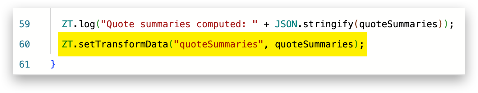 - In our example workflow of authors and quotes we have a script that transforms the data into summaries. It formats the results and and stores them like this: