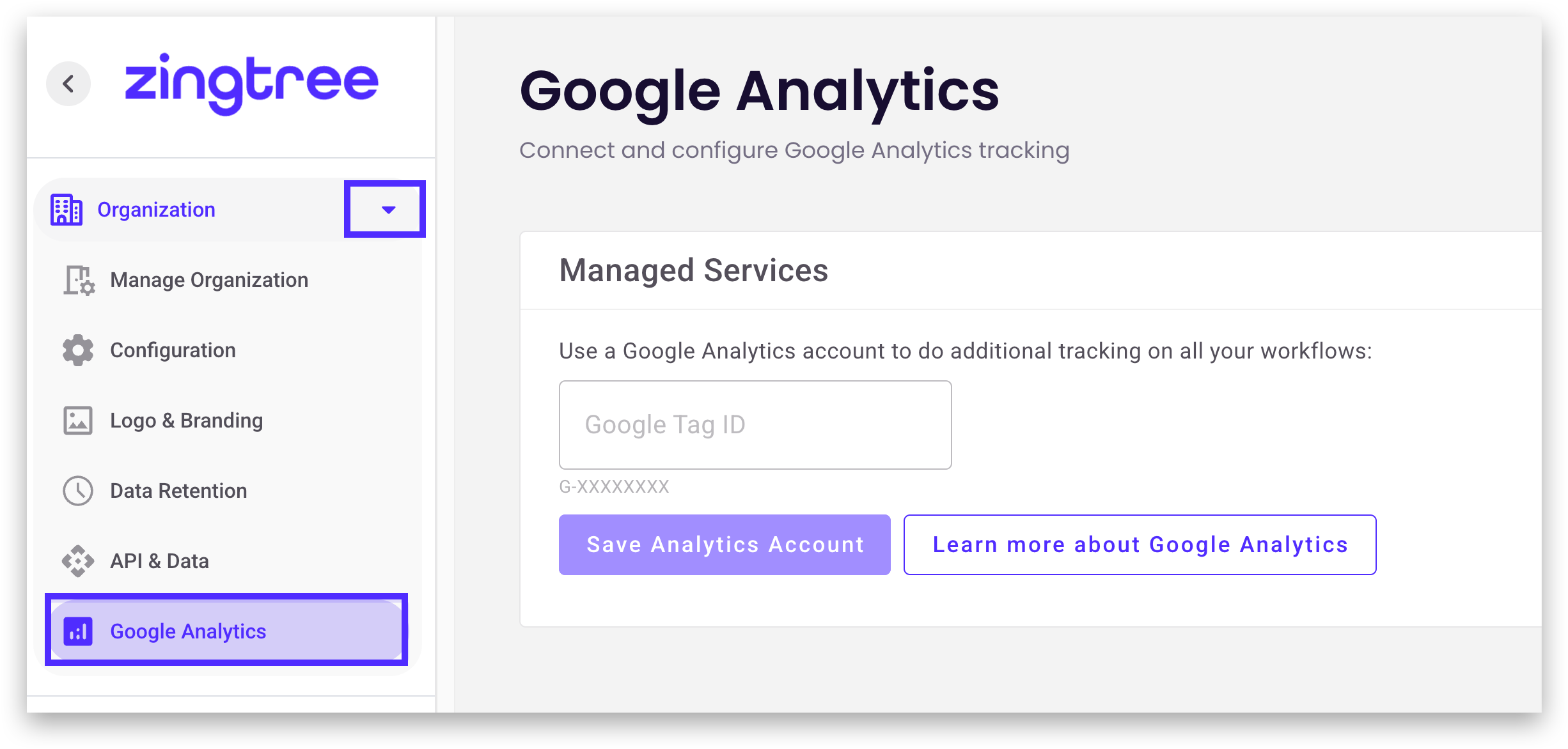 - Go to Organization and choose the Google Analytics section.