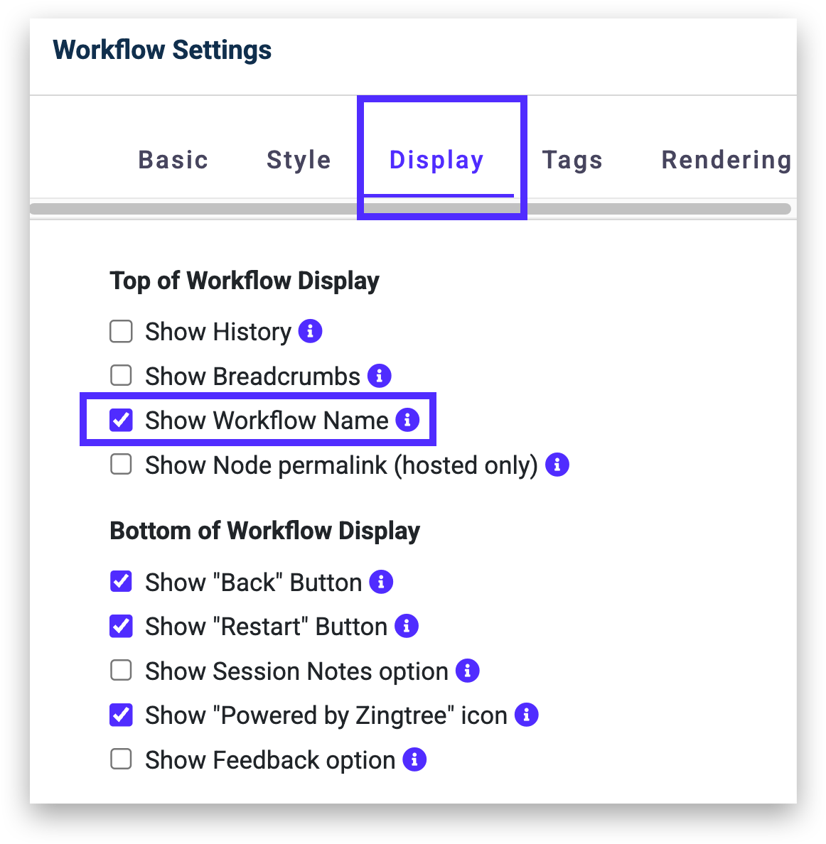 - Make sure Show workflow Name is unchecked to hide workflow titles, or checked to show workflow titles.