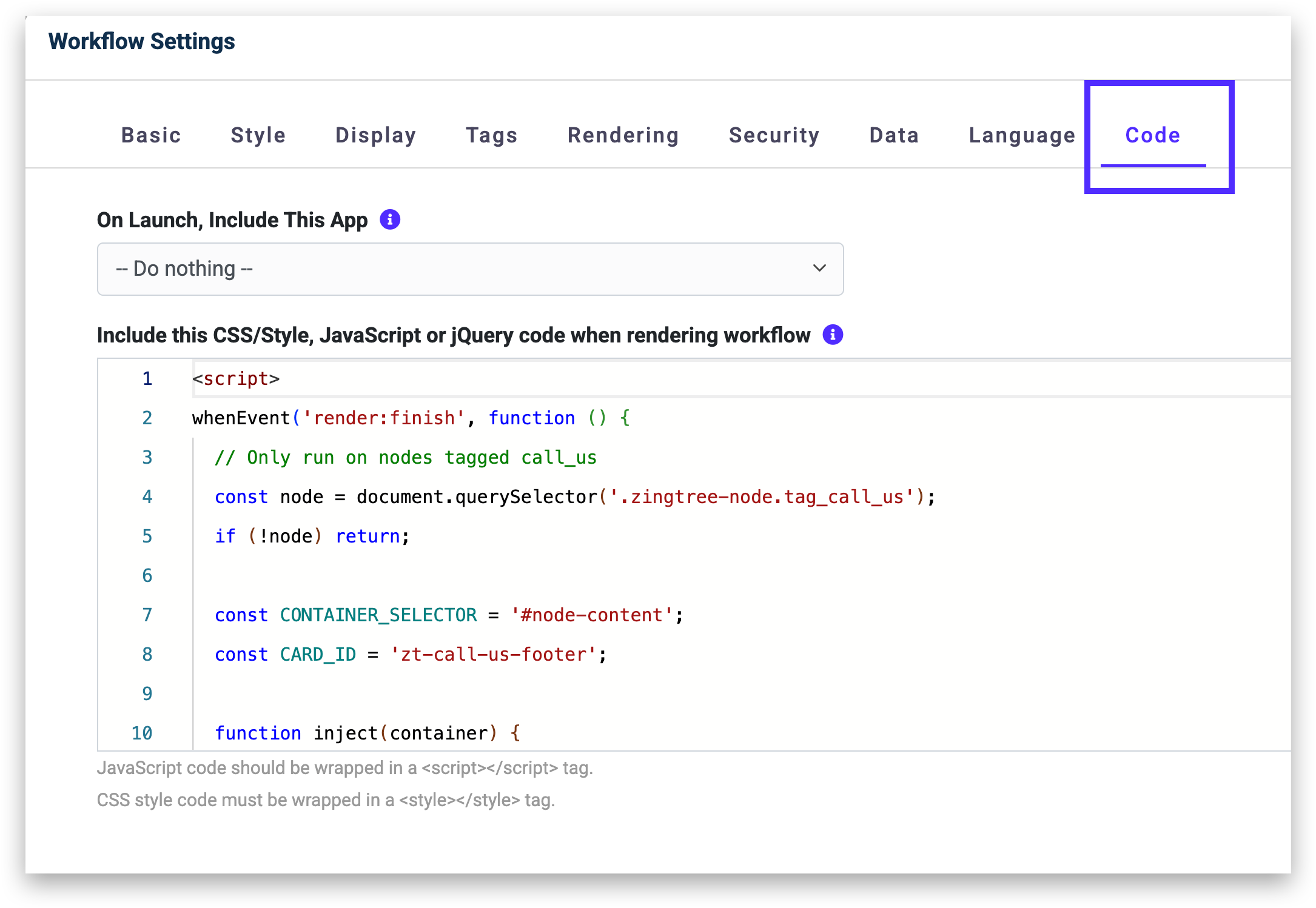 You can use the Settings tool to gracefully add code to your workflow. Also see Script Nodes for even more powerful tools.