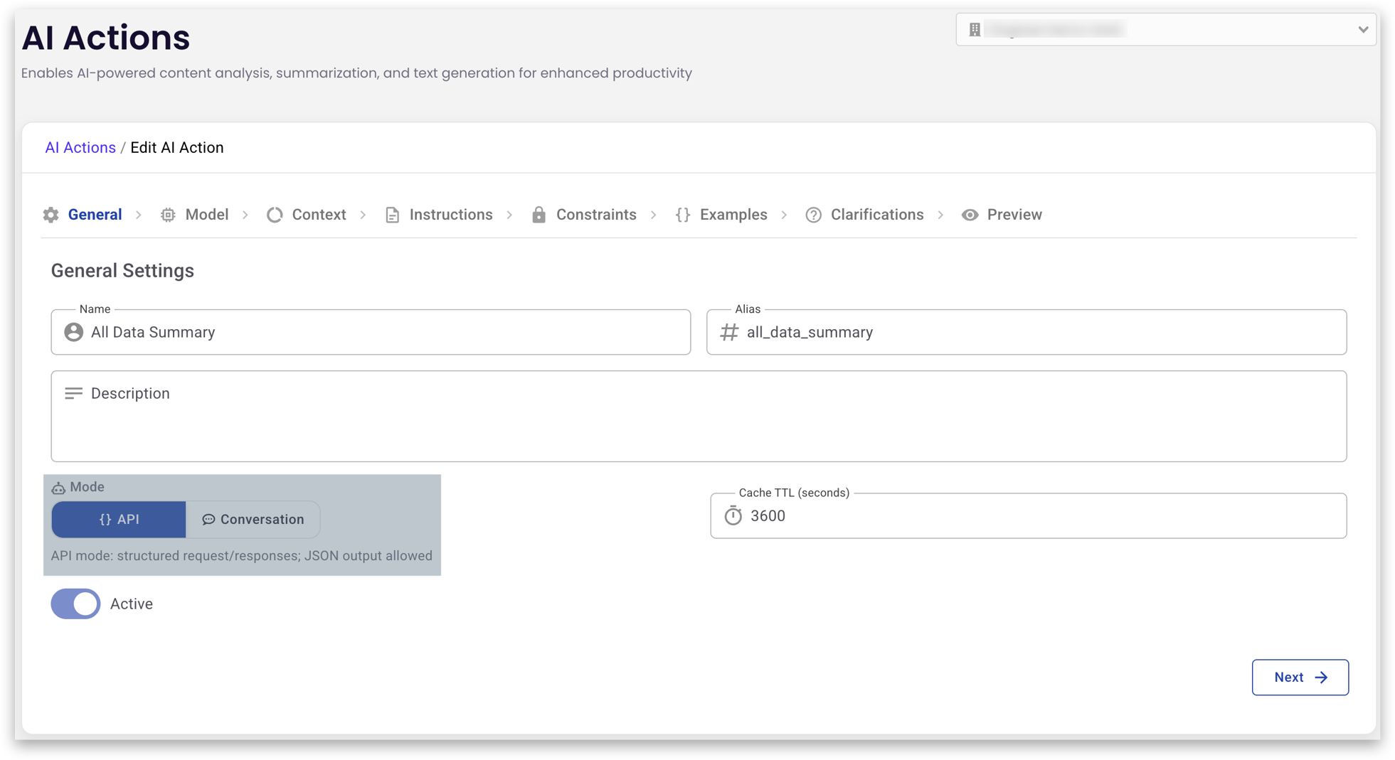 API mode allows AI output to be consumed programmatically within workflows or external integrations.