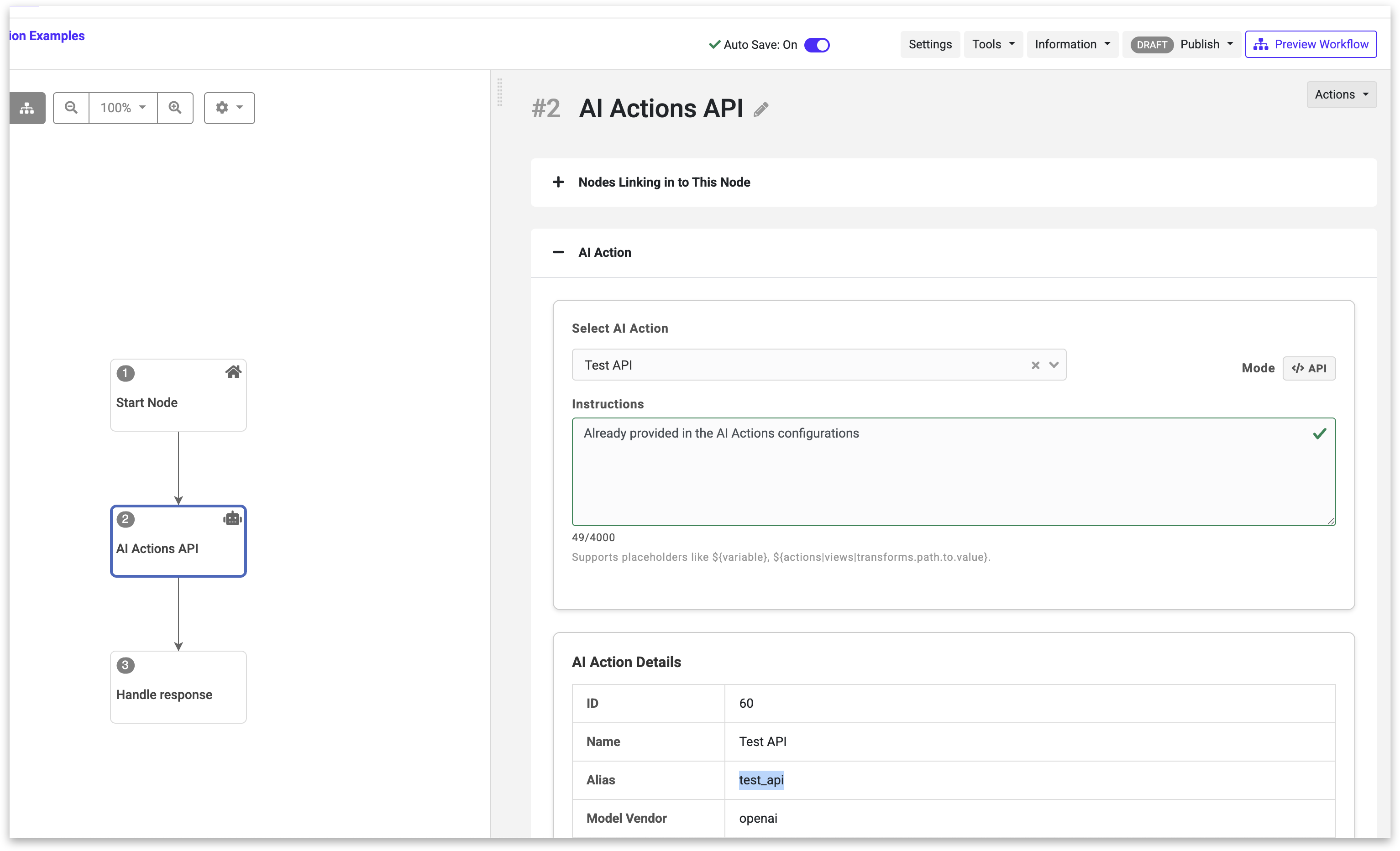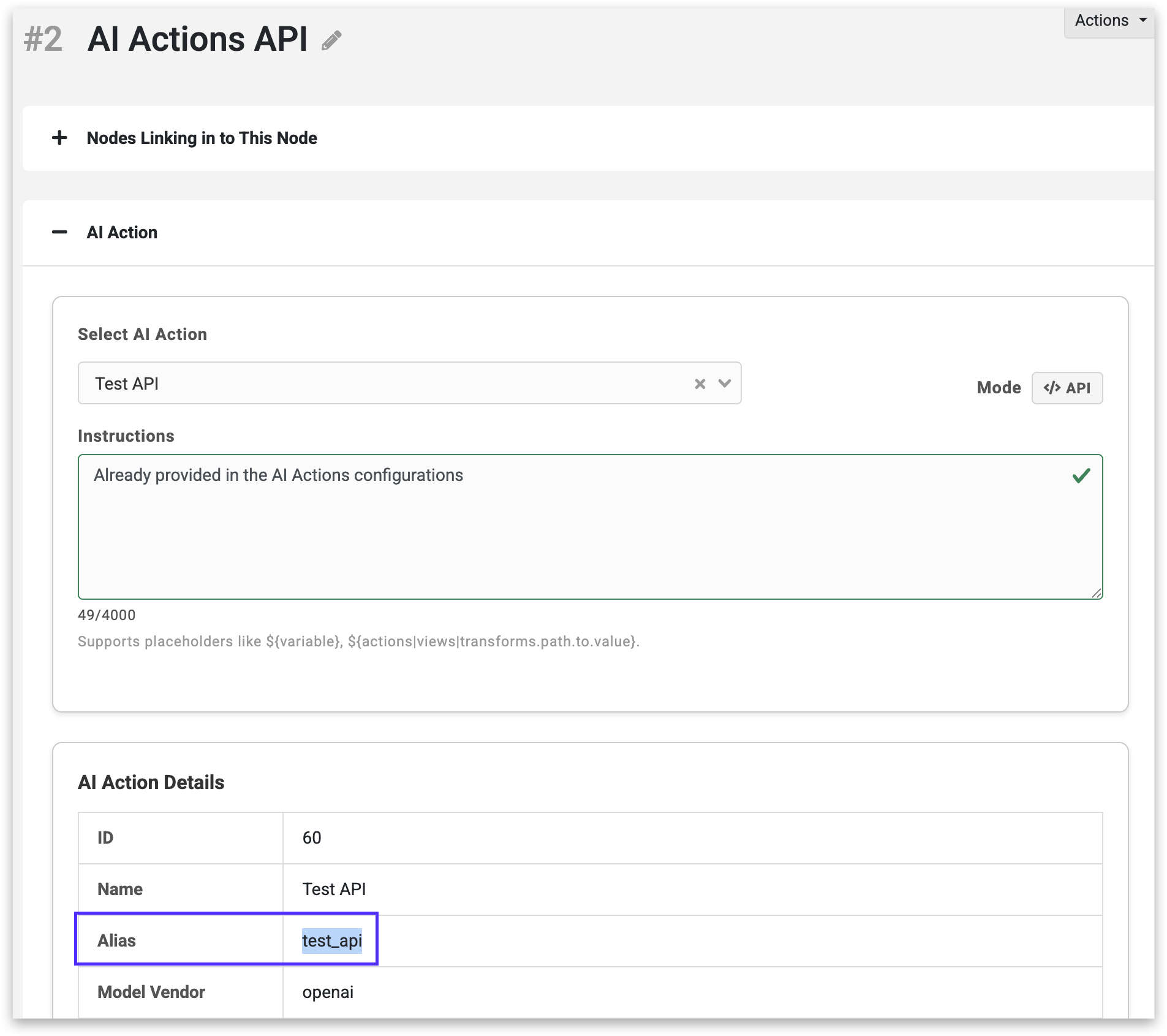AI Actions outputs will be placed on the actions namespace. Use the alias found in the AI Actions node configuration inside the workflow builder