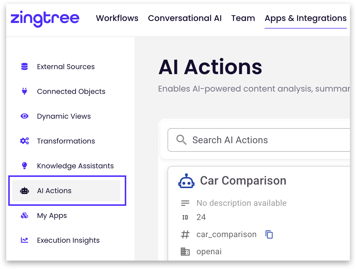 Navigate to Apps & Integrations & select AI Actions from the left navigation menu