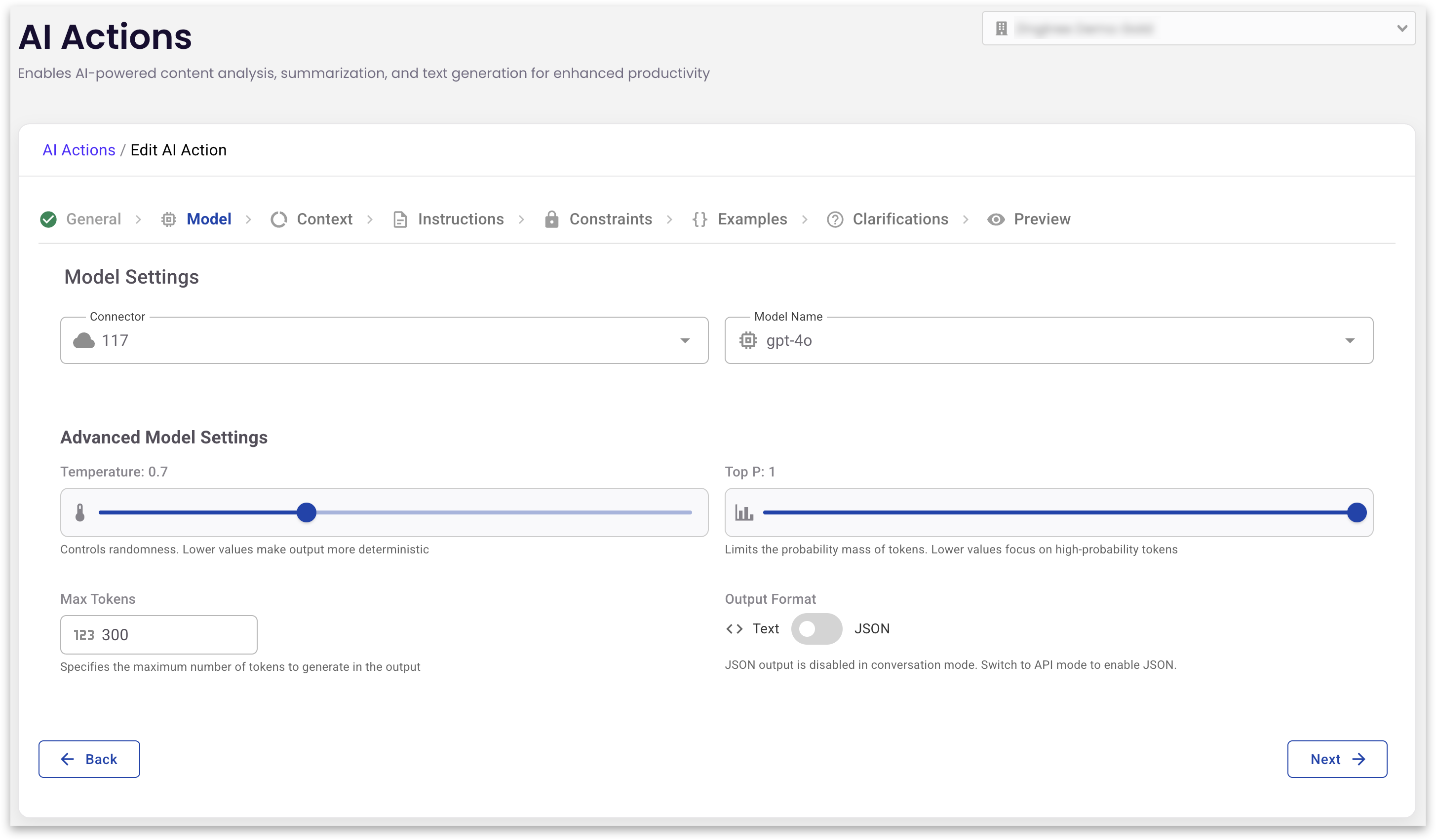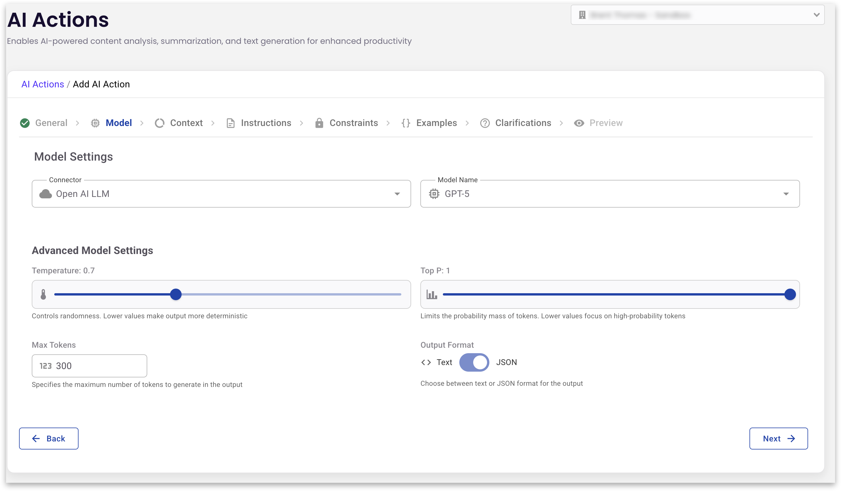 The AI model processes the provided context according to the defined system and user instructions, then returns either text or JSON depending on configuration.