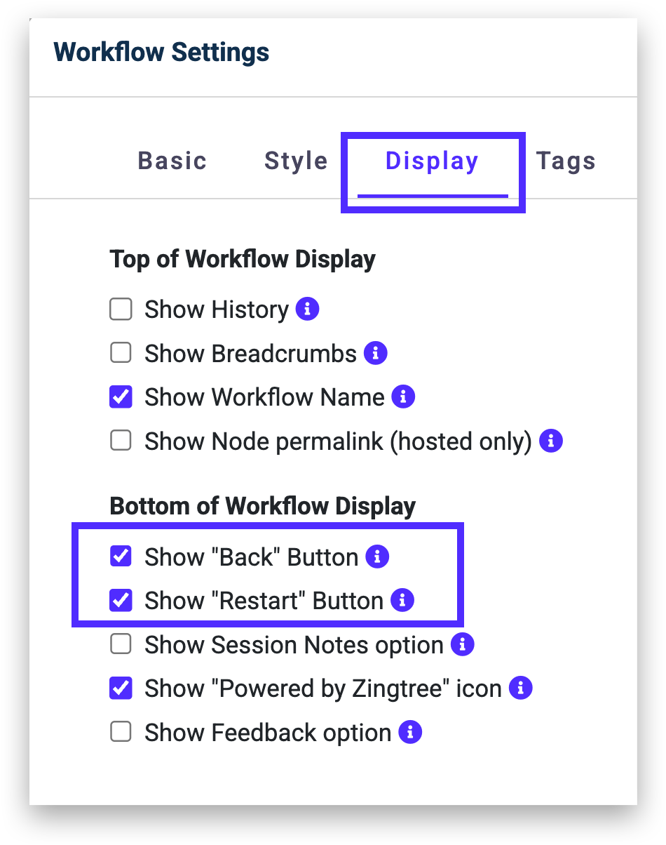 By default, when you deploy a workflow, it includes "Back" and "Restart" buttons. You can enable or disable these for your entire workflow, or for individual nodes.