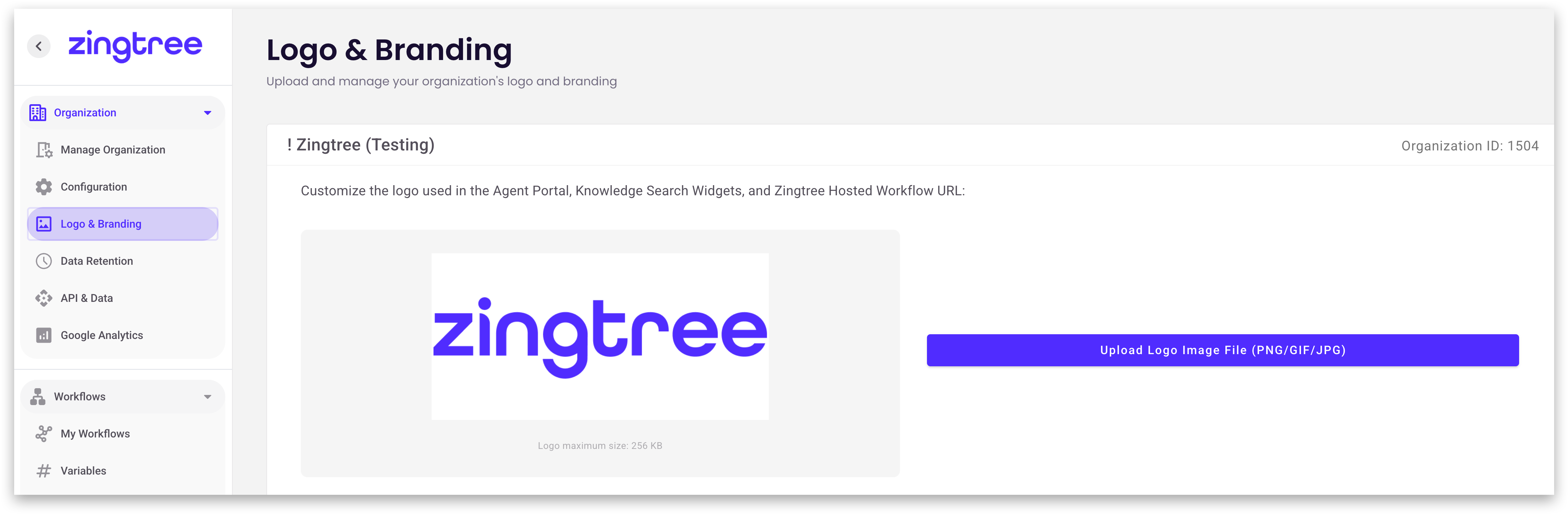 - Go to Organization > Logo & Branding in the left menu.