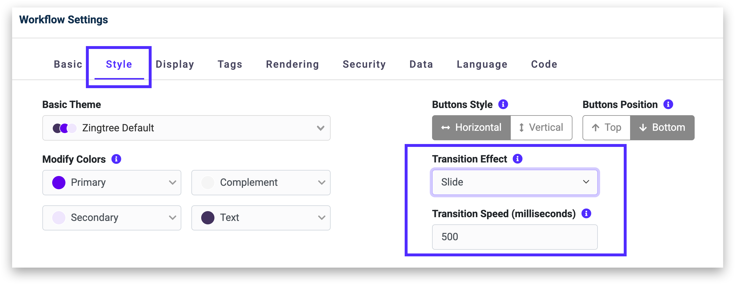 - In your workflow, open Settings. Then the Style tab. Under Transition Effect you'll find the transition effects.