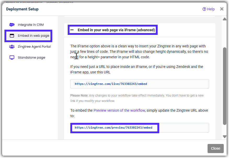 In Zingtree, find your iFrame embed code URL. You'll find this from Publish > Deployment Setup > Embed in web page > Embed in your web page via iFrame (advanced)
