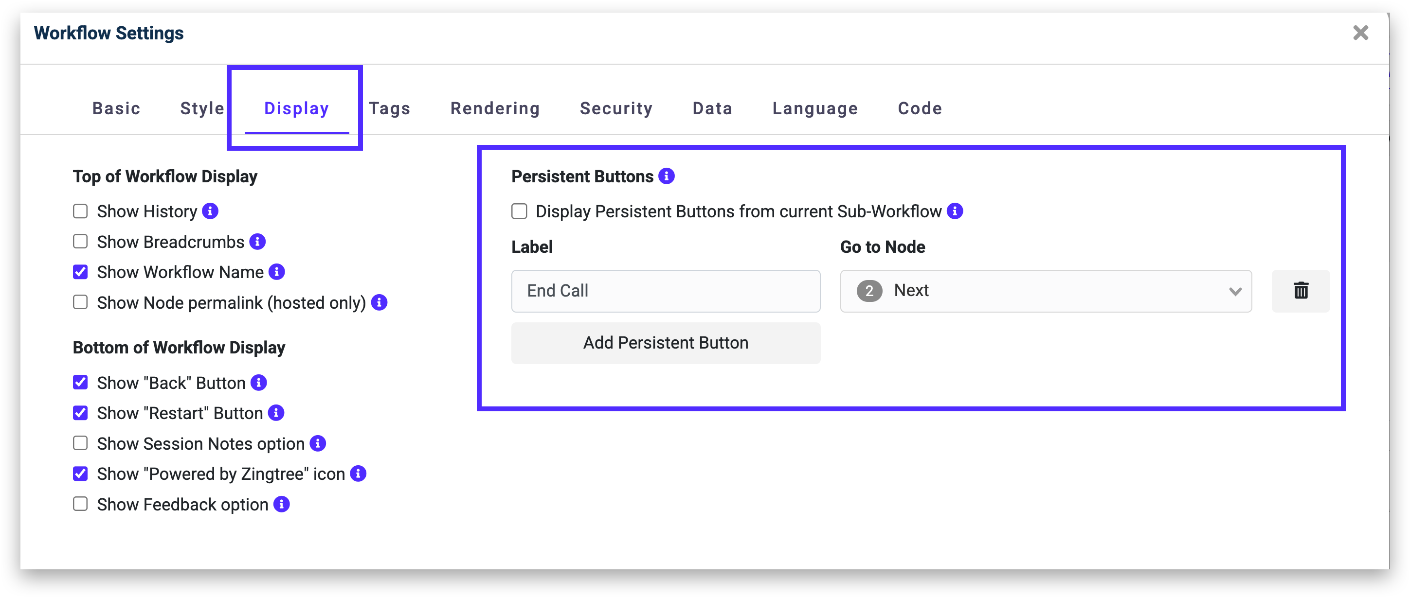 - Go into the Settings > Display Tab and add a "Persistent Button" that points (in the "Go to node" field) to the Link Node created above.