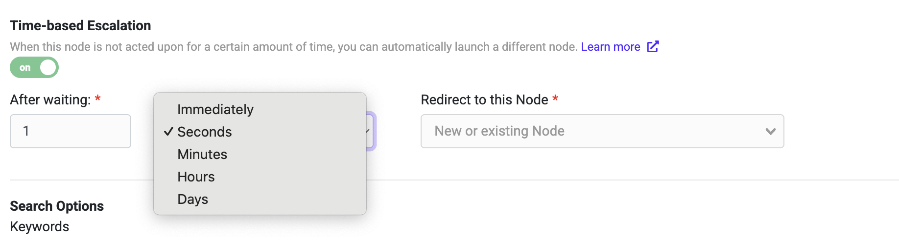 Previously, the shortest available delay (outside of immediate escalation) was 1 minute. With this update, Authors now have the flexibility to set time-based escalations using seconds, making it easier to design workflows that depend on near-immediate but slightly delayed actions, especially useful for nodes interacting with external data or APIs.