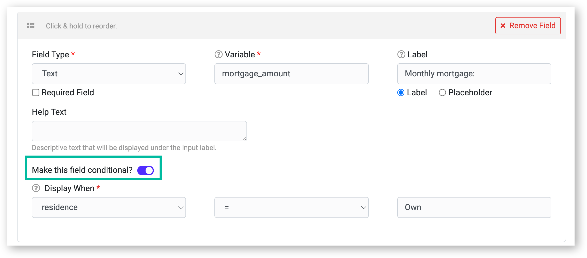 - Set logic rules (e.g., Show this field if residence = Rent)